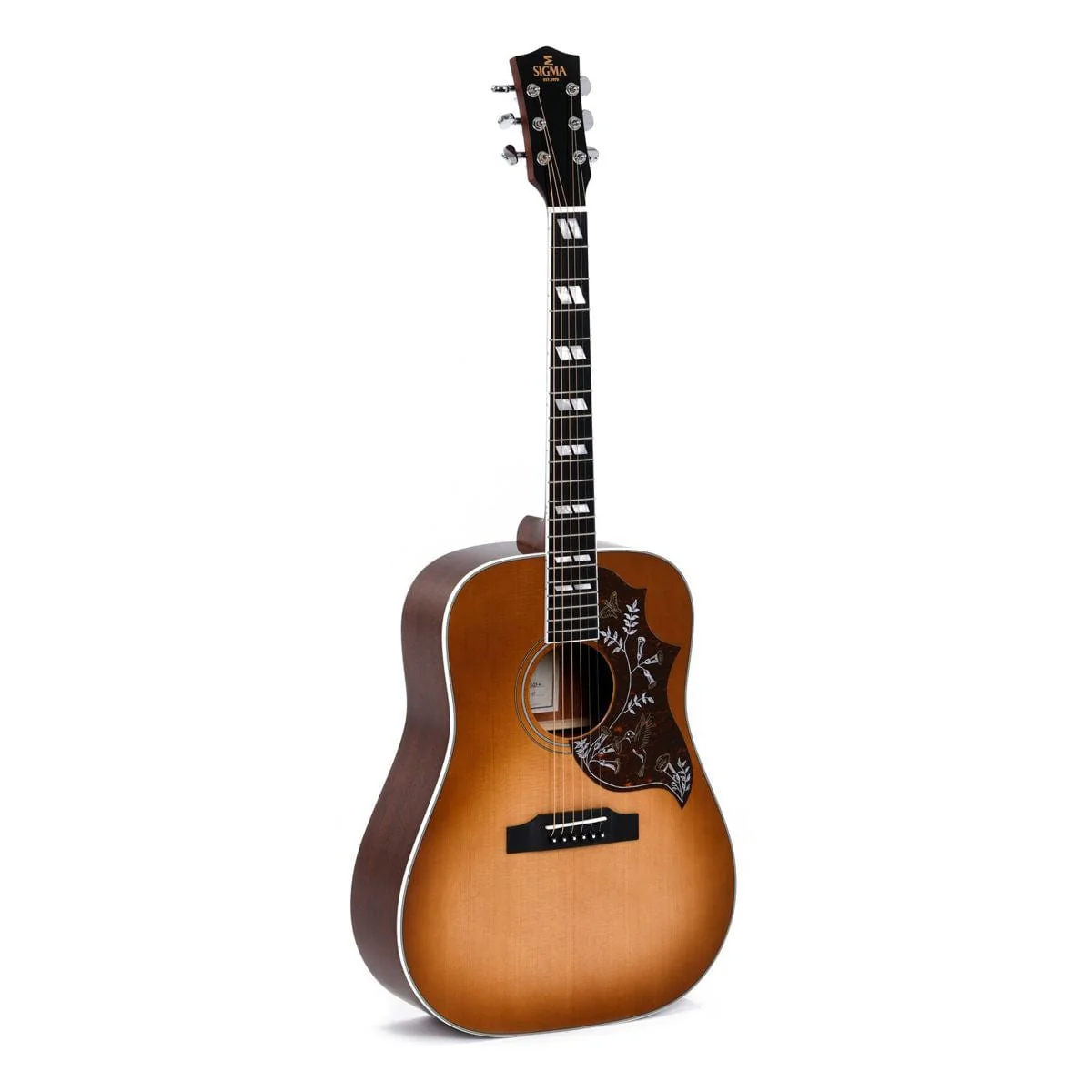 The Hummingbird is one of the most attractive flat top acoustic guitar in the history of pop and is the inspiration for the Sigma SG Series DM-SG5.The Sigma DM SG5 has that characteristic pickguard with the unmistakable silhouette of a Hummingbird that gives this instrument its name. With a 24" scale length a bridge is the belly up type and that classic heritage Cherry Sunburst finish.